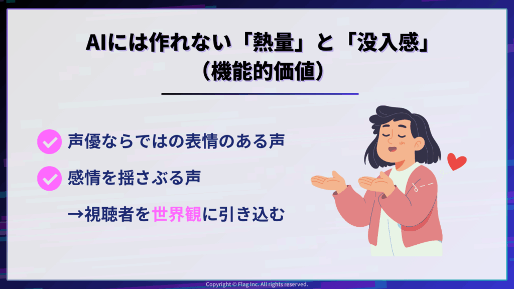 生成AIの技術進化により、ナレーションを自動生成することは容易になりました。コストも安く、修正も簡単です。では、なぜ今あえて、コストをかけてまで「プロの声優(人間)」を起用する必要があるのでしょうか?