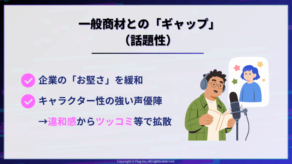 前述のサントリーや森永製菓の事例のように、一見アニメとは無縁な「お堅い企業」や「日常的な食品」に、誰もが知る「声優の声」が乗ること自体が、SNS特有の「違和感」を生みます。
