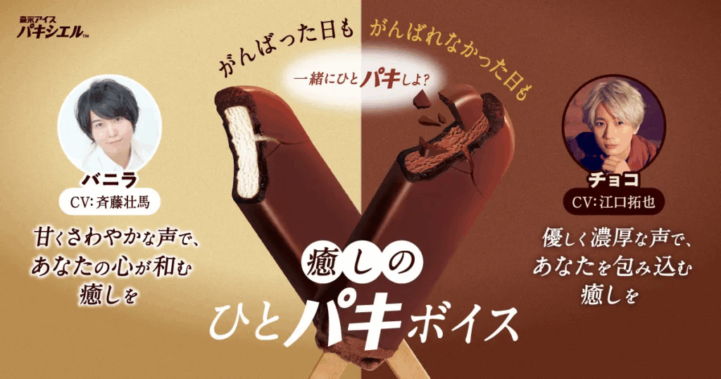 森永のチョコアイス「パキシエル」のブランドプロモーションでは、あえてキャラクターのイラストを使わず、「声」だけでアイスを擬人化しました。