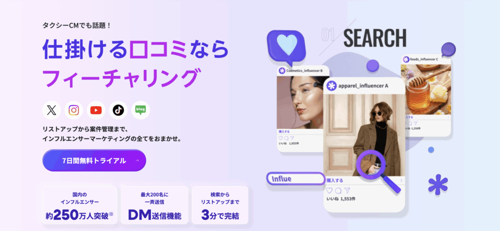 インフルエンサー検索からプロモーションの提案・結果分析まで、インフルエンサーマーケティングの全過程をサポートする、プラットフォーム「featuring」をご提供しております。