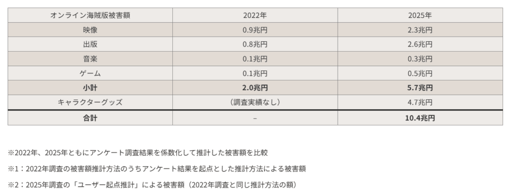 オンラインでの海賊版被害額は、2022年の2兆円から2025年には5.7兆円へと大幅に増加しました。今回初めて調査対象となったキャラクターグッズの被害額も4.7兆円にのぼり、合計すると2025年の海賊版被害総額は推計10.4兆円に達しています。