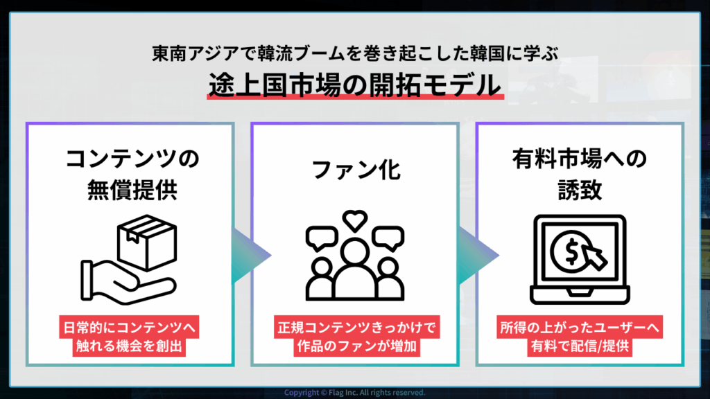 海賊版対策は、本来得られた逸失利益を取り戻すための施策であると同時に、将来の市場を拡大するための戦略でもあります。海賊版にシェアを奪われている地域では、あえて無料・廉価で公式コンテンツを提供することによって海賊版を撲滅し、ユーザが高所得になった際に有料課金してもらえるよう、将来の市場作りのための戦略投資を行うことも重要です。