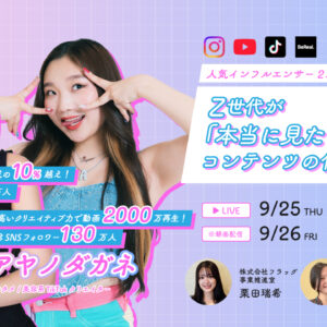 本セミナーでは、TikTokで120万人超のフォロワーを持ち、海外でも人気を集めるアヤノダガネ氏と、総いいね数1,800万超を誇る美容インフルエンサー月姫(るね)氏をゲストに迎え、インフルエンサー自身の視点から、Z世代に届くPRやコンテンツの作り方について率直に語ります。