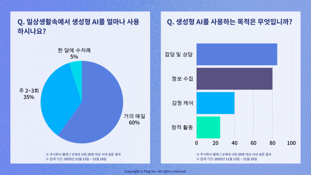설문 결과, 응답자의 60%가 AI를 ‘거의 매일 사용한다’고 답했으며, 주 2~3 회 이상 사용자까지 합치면 95%에 달합니다. 주목할 점은 이용 목적입니다. 정보 검색(80%)은 물론, 40%가 ‘감정 케어 및 멘탈 서포트’를 위해 AI를 찾고 있습니다.. ChatGPT를 ‘챳피’라는 애칭으로 부르는 사원이 많을 정도로 AI는 이미 이들의 일상 깊숙이 자리 잡았습니다.