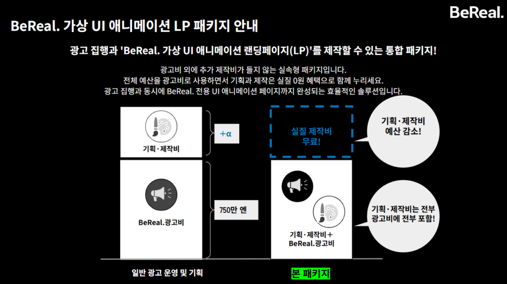 ‘BeUP!’은 BeReal.의 UI 애니메이션 페이지 제작비가 광고비에 포함된 활용도 높은 패키지 상품입니다.