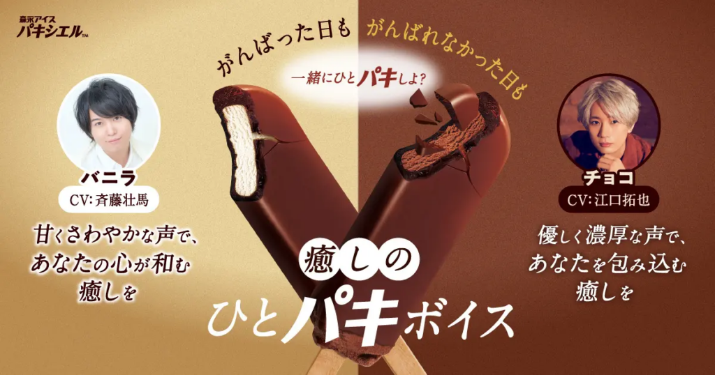 인기 성우 에구치 타쿠야와 사이토 소마가 진한 초코맛과 깔끔한 바닐라맛의 특징을 오직 ‘목소리 연기’만으로 담아냈습니다.TV 광고 없이 SNS를 중심으로 한 온라인상의 ‘소리’에만 집중한 결과, ‘귀가 즐겁다’는 반응과 함께 SNS에서 큰 화제가 되었고 판매량은 5년 전보다 2.6배나 늘어났습니다.