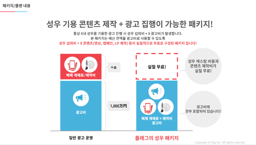 이러한 고민을 한 번에 해결해 드리기 위해 플래그는 X 및 일본 성우 기획사와 공동 개발한 광고 패키지를 제공하고 있습니다.