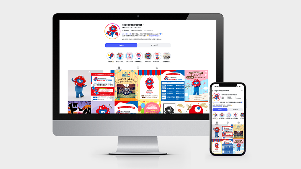 X・Instagramにおいて、グッズの商品情報やミャクミャクのキャラクター性にフォーカスした多角的なコンテンツを企画・発信。投稿画像・動画などのアセット制作からキャンペーン企画の実行まで一貫してサポートしています。